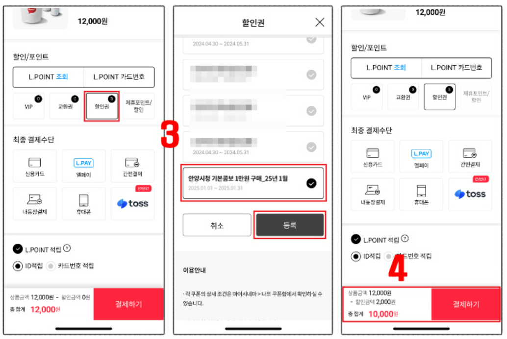 - 할인권 클릭 후 해당 쿠폰 선택 후 등록 > 할인금액 확인 후 최종 결제하기