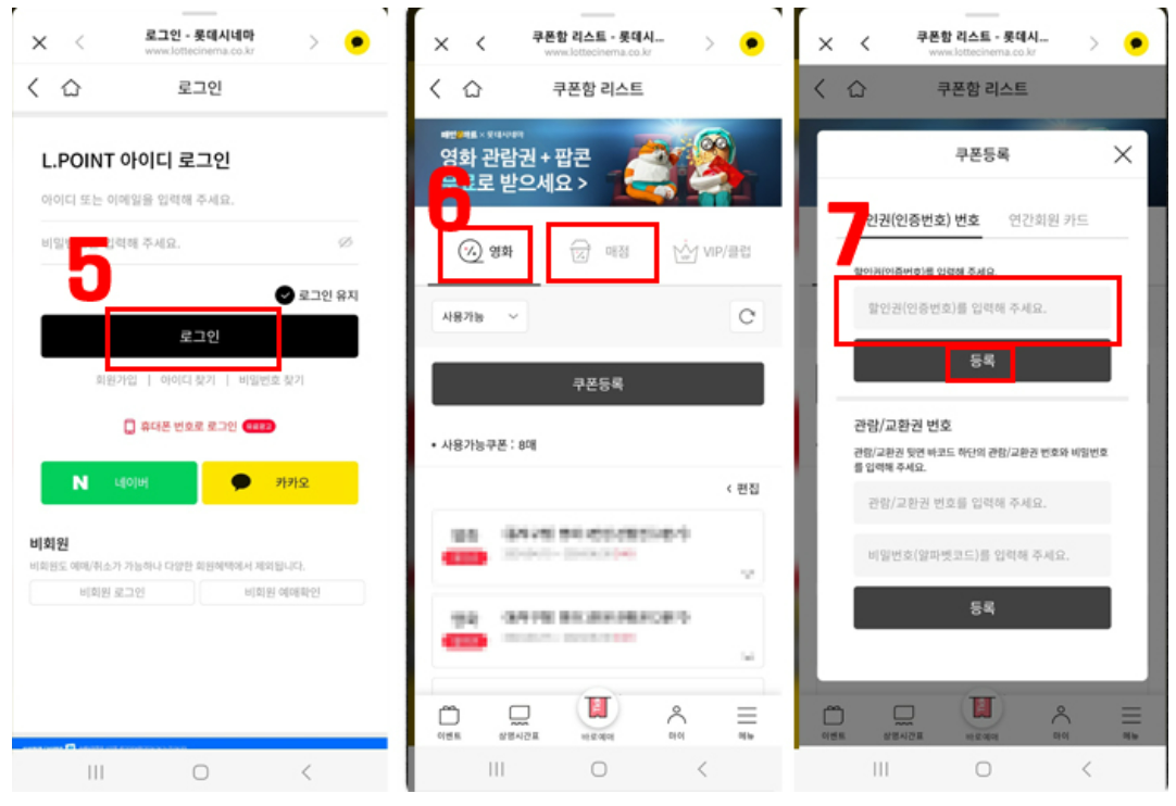 - 롯데시네마 앱 또는 홈페이지에서 로그인하기 > 영화, 매점을 선택한 후 쿠폰등록 > 복사한 쿠폰번호를 붙여넣기 한후 등록